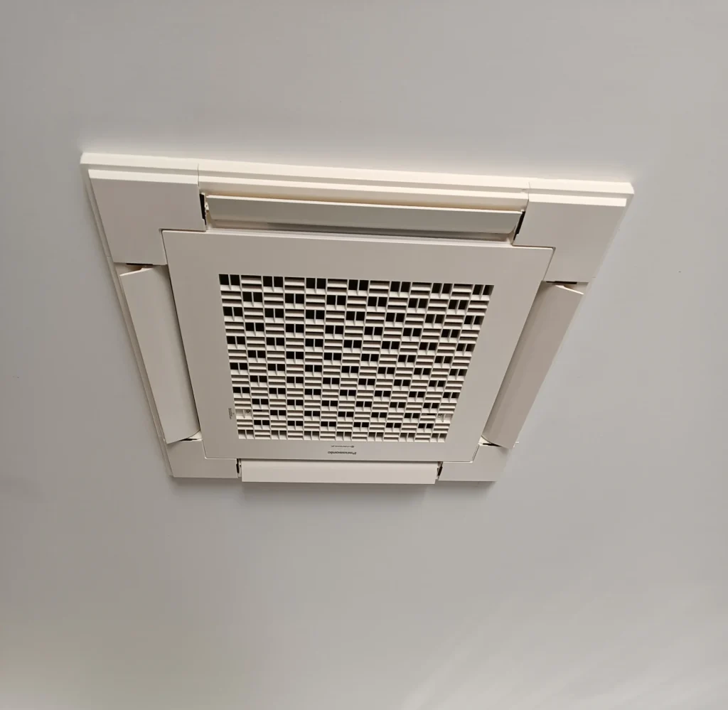 On retrouve plus communément la cassette 4 voies dans l’industrie ou les magasins. Encastrée dans le plafond, elle présente pourtant l’avantage d’être centrée sur la pièce et souffle sur ses 4 côtés. L’air est donc mieux réparti, le ventilateur tourne moins fort pour arriver au même résultat qu’un split ou une console, et donc la cassette 4 voies est plus silencieuse pour plus de confort.